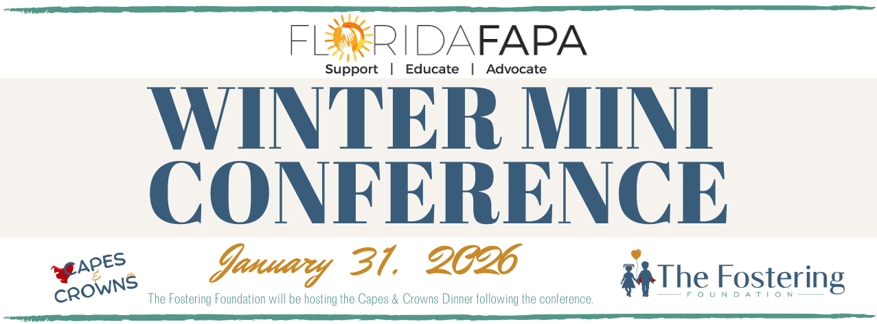 Florida FAPA 2026 Winter Mini Conference Join us for a great day of Training for foster and adoptive caregivers. NexGen Program available for Tweens and Teens impacted by foster care and/or adoption. Limited childcare space available. |